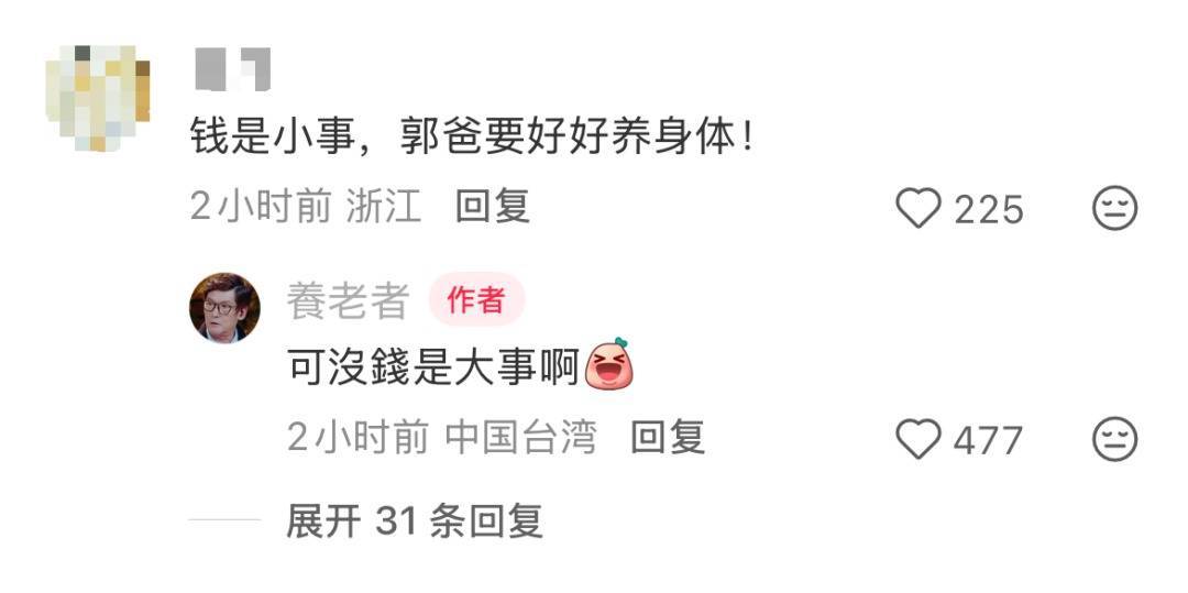 有网友在评论区留言:钱是小事,郭爸要好好养身体。郭碧婷父亲回复:可没钱是大事啊。